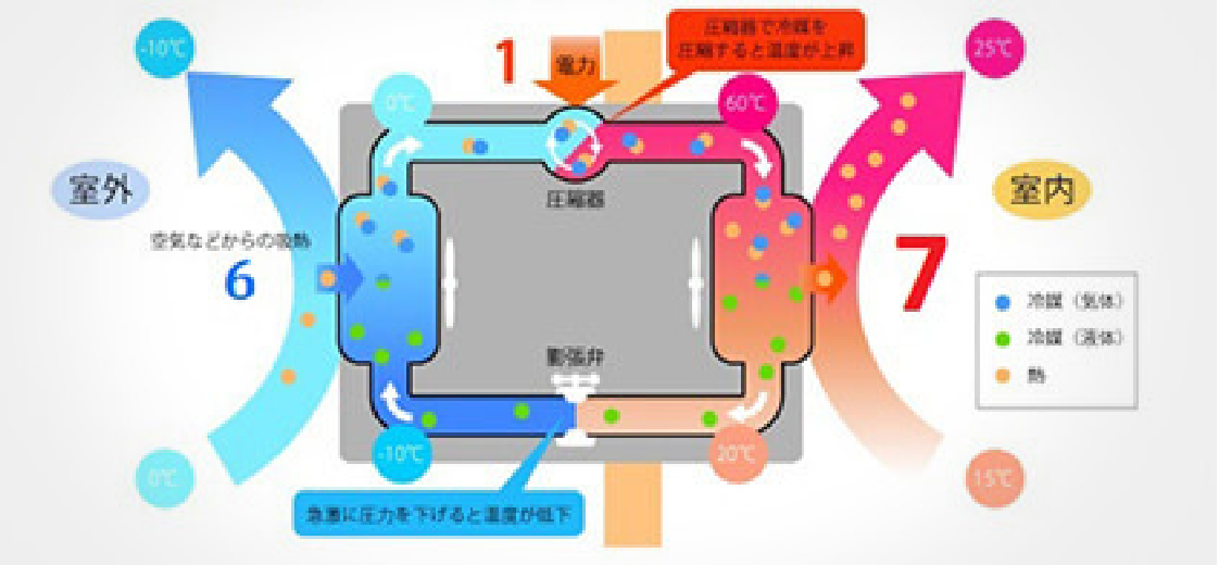 ヒートポンプで空気熱などをくみ上げ、空調や給湯などに活用しています。